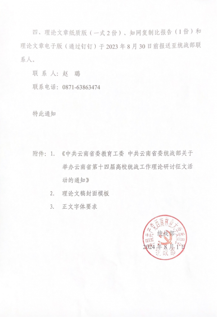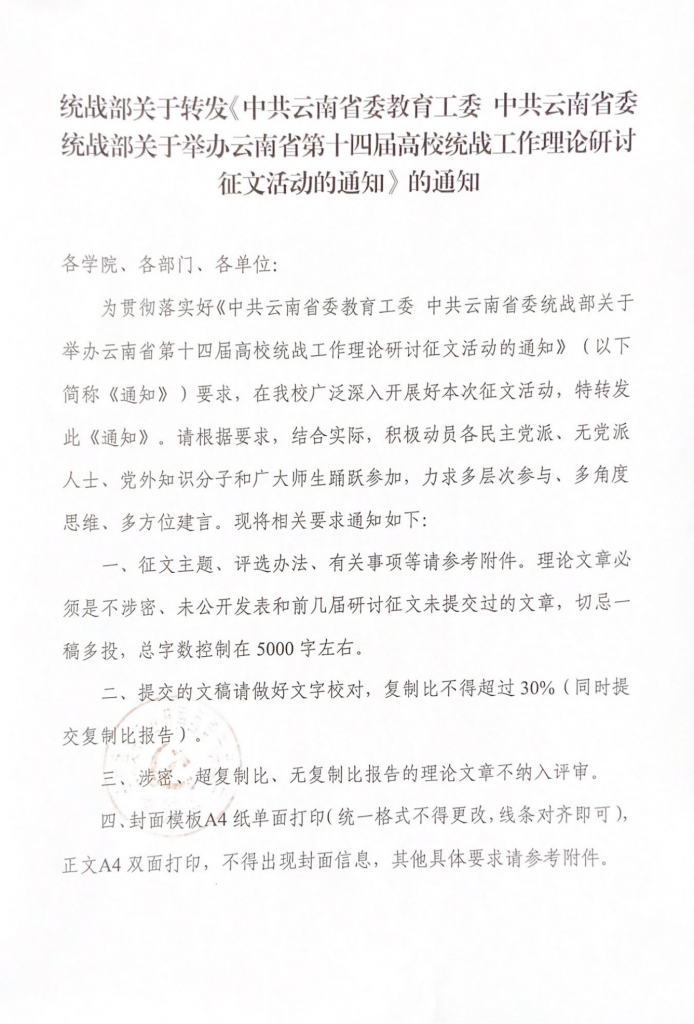 附件1:中共云南省委教育工委 中共云南省委统战部关于举办云南省第十四届高校统战工作理论研讨征文活动的通知